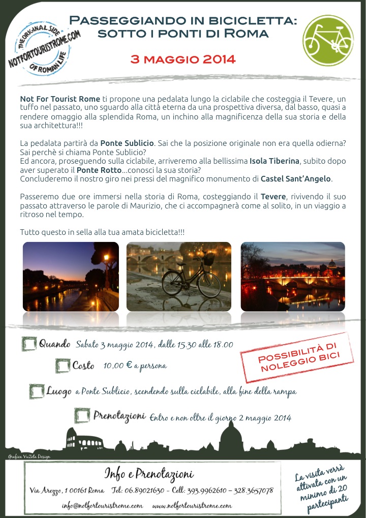 Not For Tourist Rome ti propone una pedalata lungo la ciclabile che costeggia il Tevere, un tuffo nel passato, uno sguardo alla città eterna da una prospettiva diversa, dal basso, quasi a rendere omaggio alla splendida Roma, un inchino alla magnificenza della sua storia e della sua architettura!
