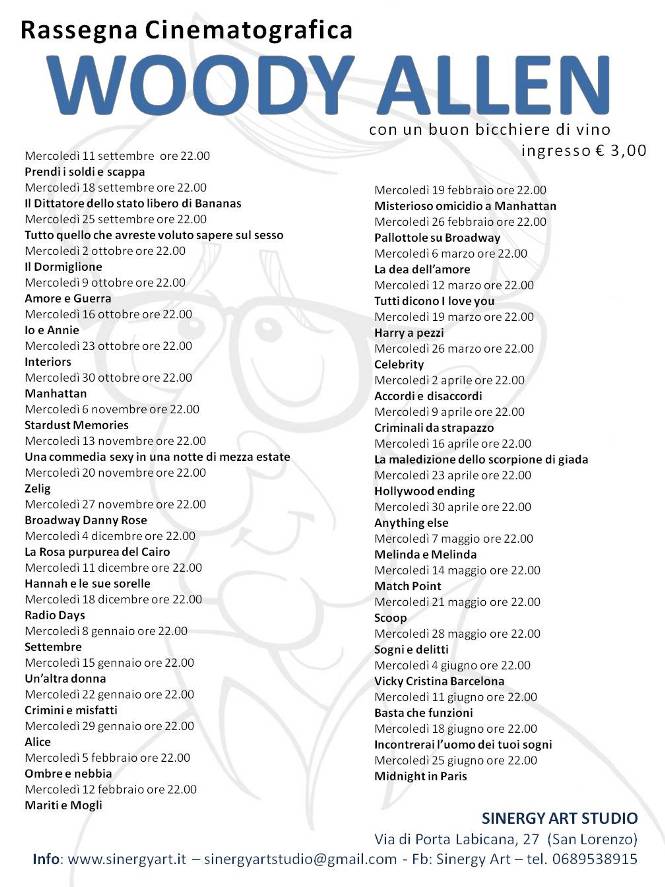 L’Associazione Culturale Cinem’Art, in collaborazione con il Sinergy Art Studio, presenta la Rassegna Cinematografica Woody Allen.